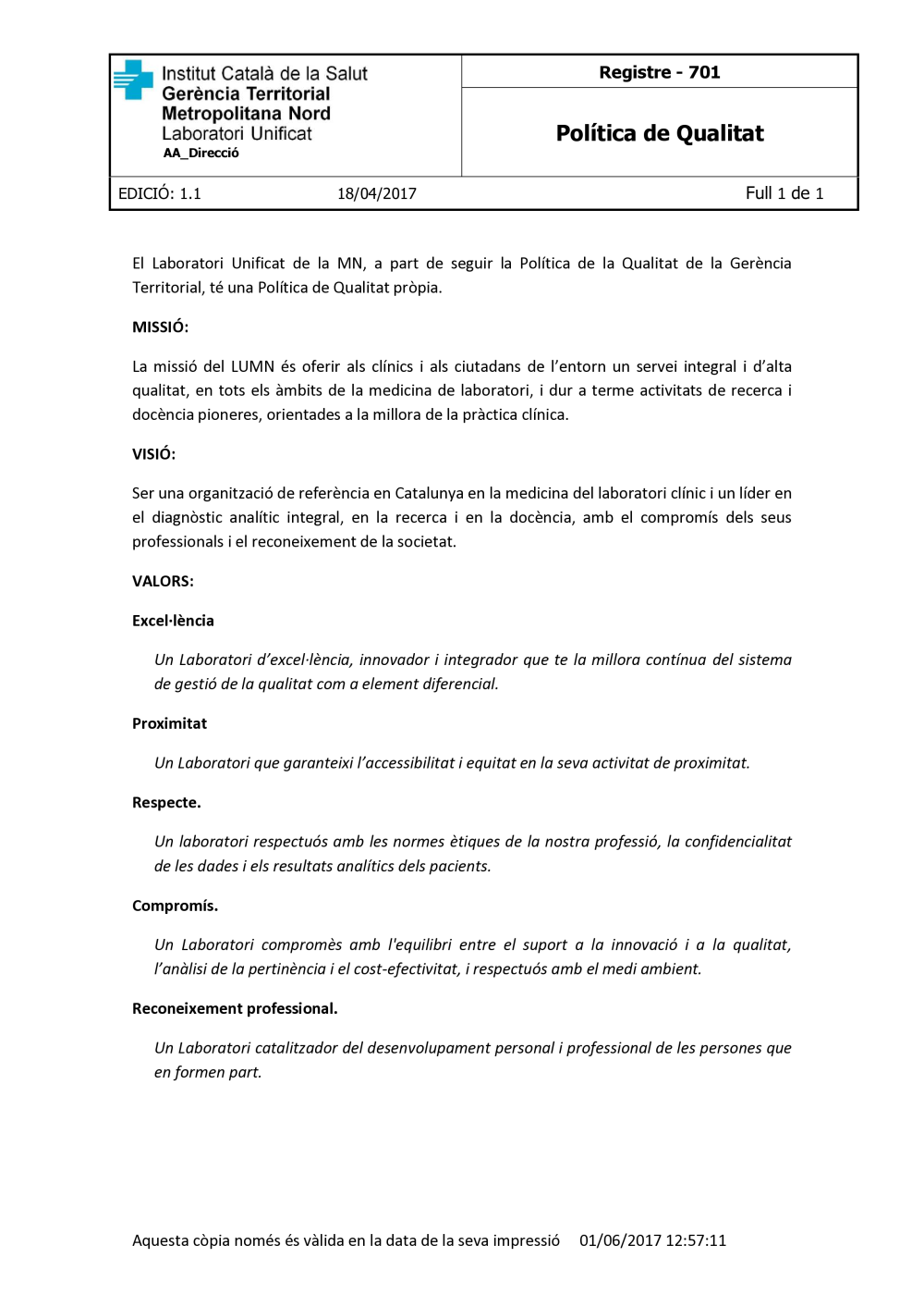 El Laboratorio de Análisis Clínicos Generales y Atención Continuada tiene una cartera de servicios amplia y compleja y una actividad analítica importante, que se lleva a cabo con unos criterios exigentes. La calidad de los resultados analíticos está garantizada y desde el año 2000 el laboratorio está certificado por la Norma UNE-EN-ISO 9001:2008. Además, tiene implantado un sistema de gestión de la calidad basado en la mejora continúa y hace una monitorización de la calidad de las fases preanalítica, analítica y postanalítica.