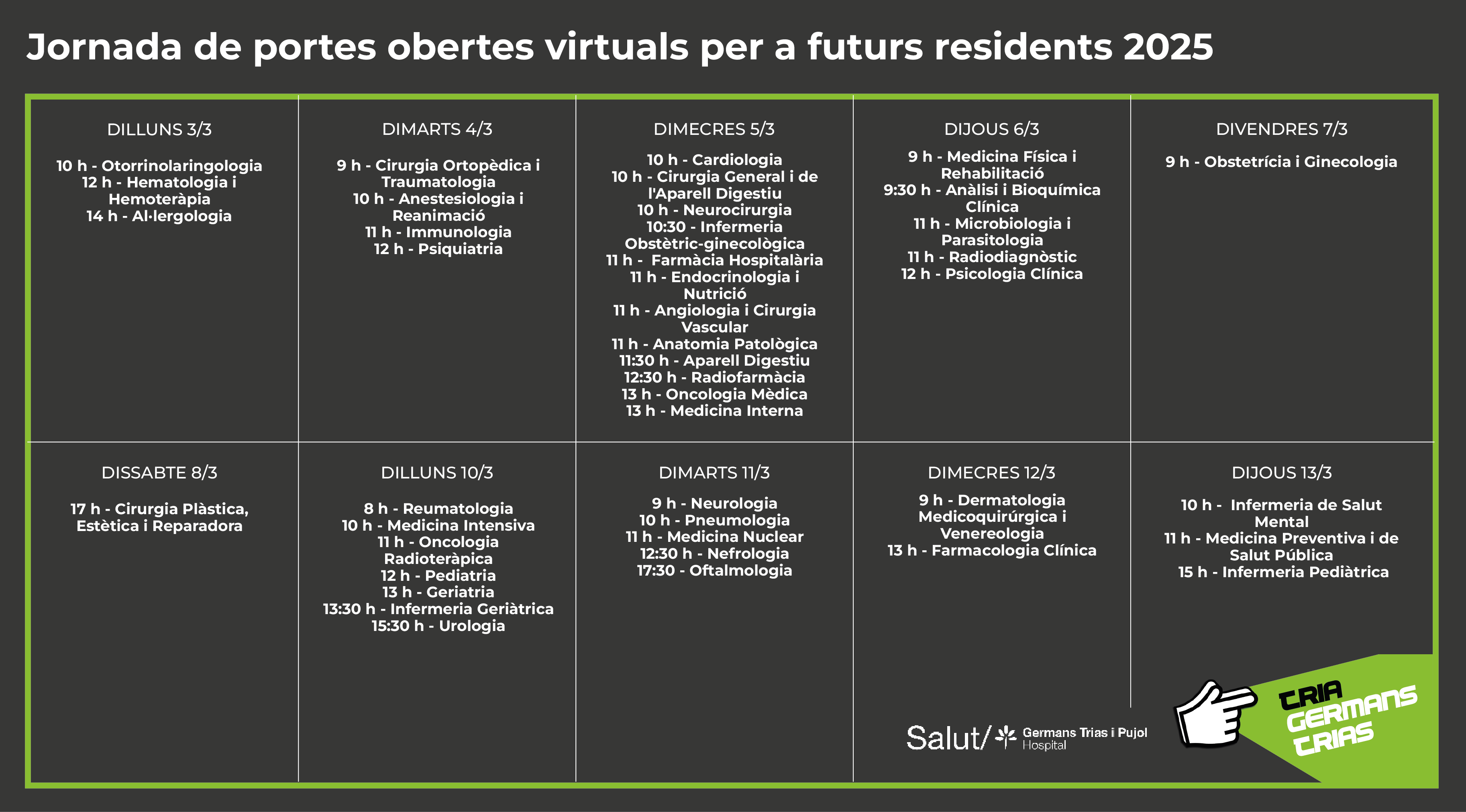 A més, també es celebraran diferents reunions virtuals de cadascuna de les especialitats entre el 3 i el 13 de març. En elles podràs parlar i consultar tots els dubtes que tinguis directament amb els residents actuals de l'Hospital.